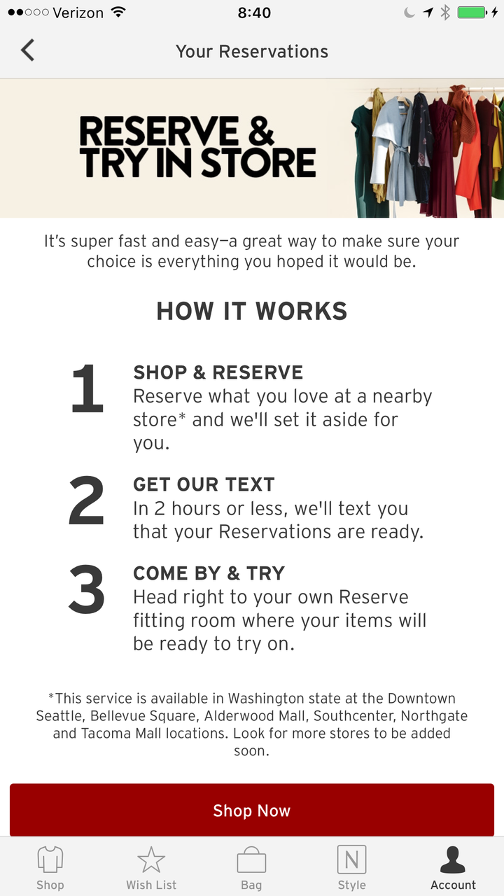 トップ画像:ノードストローム・アプリの試着用の取り置きサービス「リザーブ&トライ・イン・ストア(Reserve & Try In Store)」スクリーンショット。利用の仕方は1)最寄りのノードストロームでアプリ経由で試着予約をして、2)メールで2時間以内に準備完了で通知し、3)商品を受け取って試着する。ワシントン州シアトル市内にあるノードストローム旗艦店などでテスト展開を行っており、テスト後は全店に展開する予定だ。