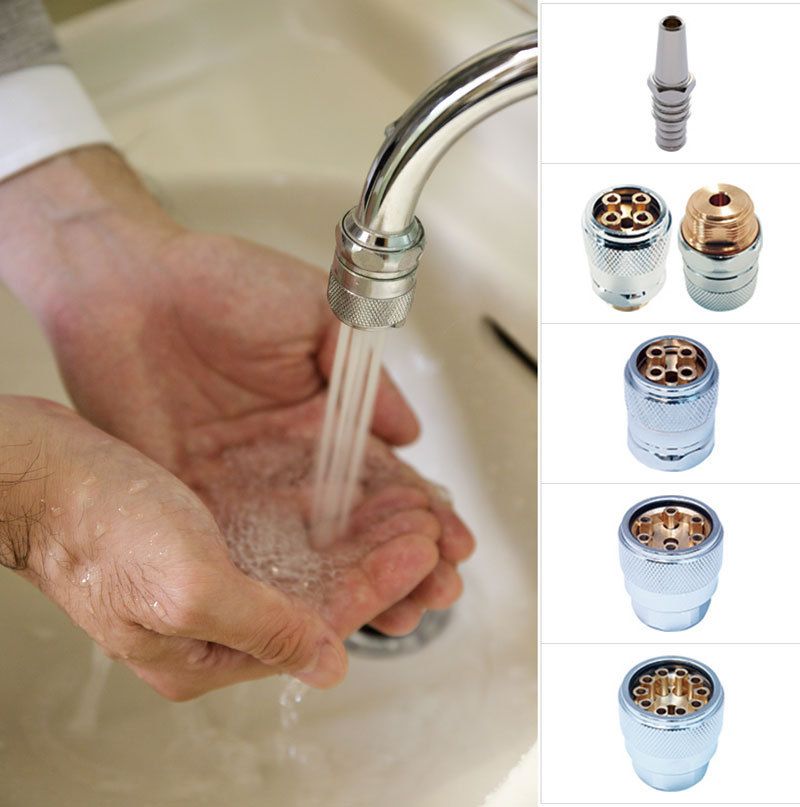 バブル90は、流し洗いで使う水の量を最大10分の1まで減らせる節水ノズル。内部で水道水に空気を効率よく含ませ、泡沫水を振動させて高圧で放出させることにより、少ない水できれいに洗浄できる。蛇口に付けるだけで利用でき、リングを回すだけで水圧・水量調整が可能。用途やつなぎ先によってノズルの形状は5種類ある。