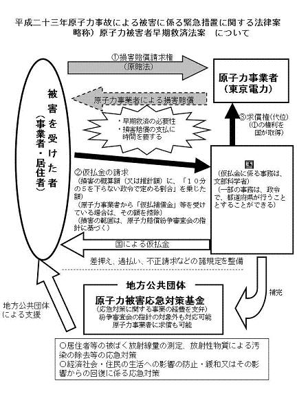 本法案は、東京電力の賠償責任は厳しく追及しつつも、原子力被害者救済に国が前面に立つことにより、これを早期に行おうとするもの。いわば「原子力被害者早期救済法案」。