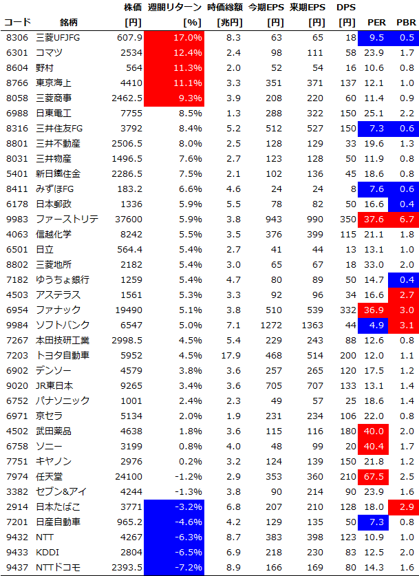 個別銘柄の週間パフォーマンス(2016/11/4-11/11)