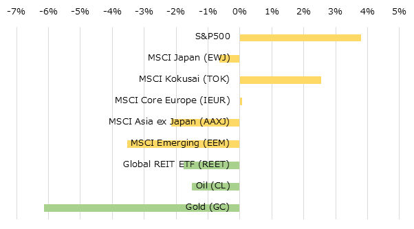 出所: iShares: MSCI Japan (EWJ), MSCI Kokusai (TOK)、MSCI Core Europe (IEUR), MSCI All Country Asia Pacific ex Japan (AAXJ), MSCI Emerging Markets (EEM), GLOBAL REIT ETF (REET). Bloomberg.com: Oil WTI Futures (CL1), Gold Futures (GC1)