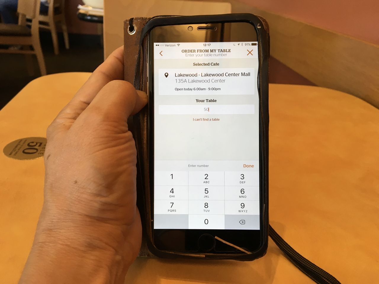 GPS機能から店舗(レイクウッドモールにあるパネラブレッド)が表示される。着席したテーブル番号を入力するだけだ。テーブルにある「50」を入力。