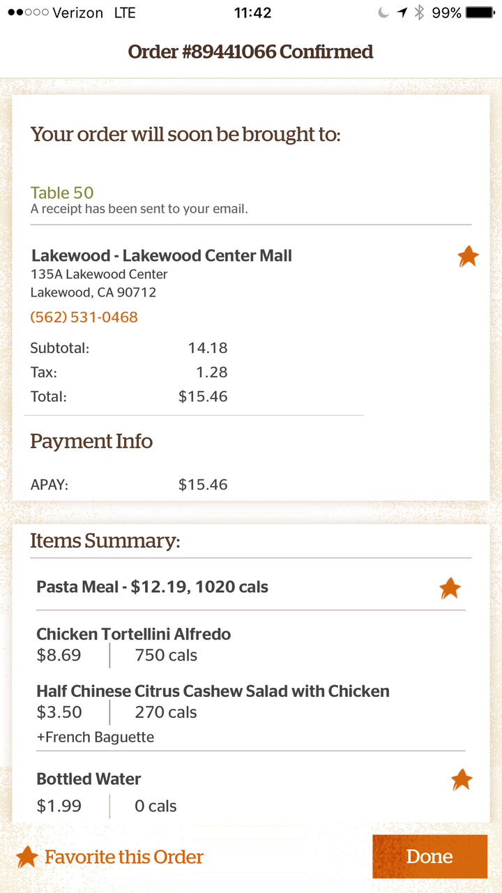 この日はチキン・アルフレッド・パスタとサラダを注文。料金(15.46ドル)に食材やカロリーも表示されている。支払いはアップルペイ。「承った注文品はテーブル50にすぐにお持ちします」とある。