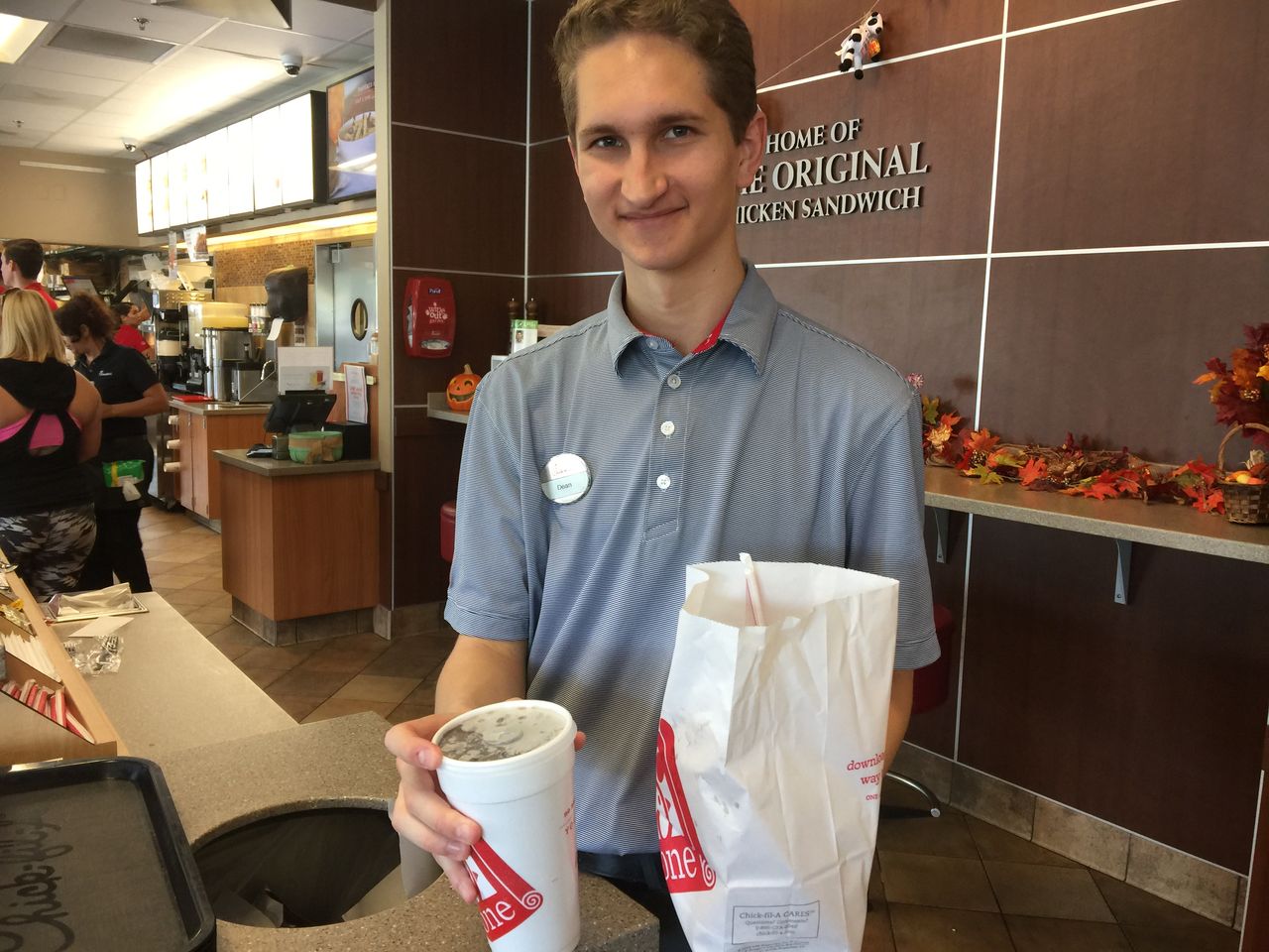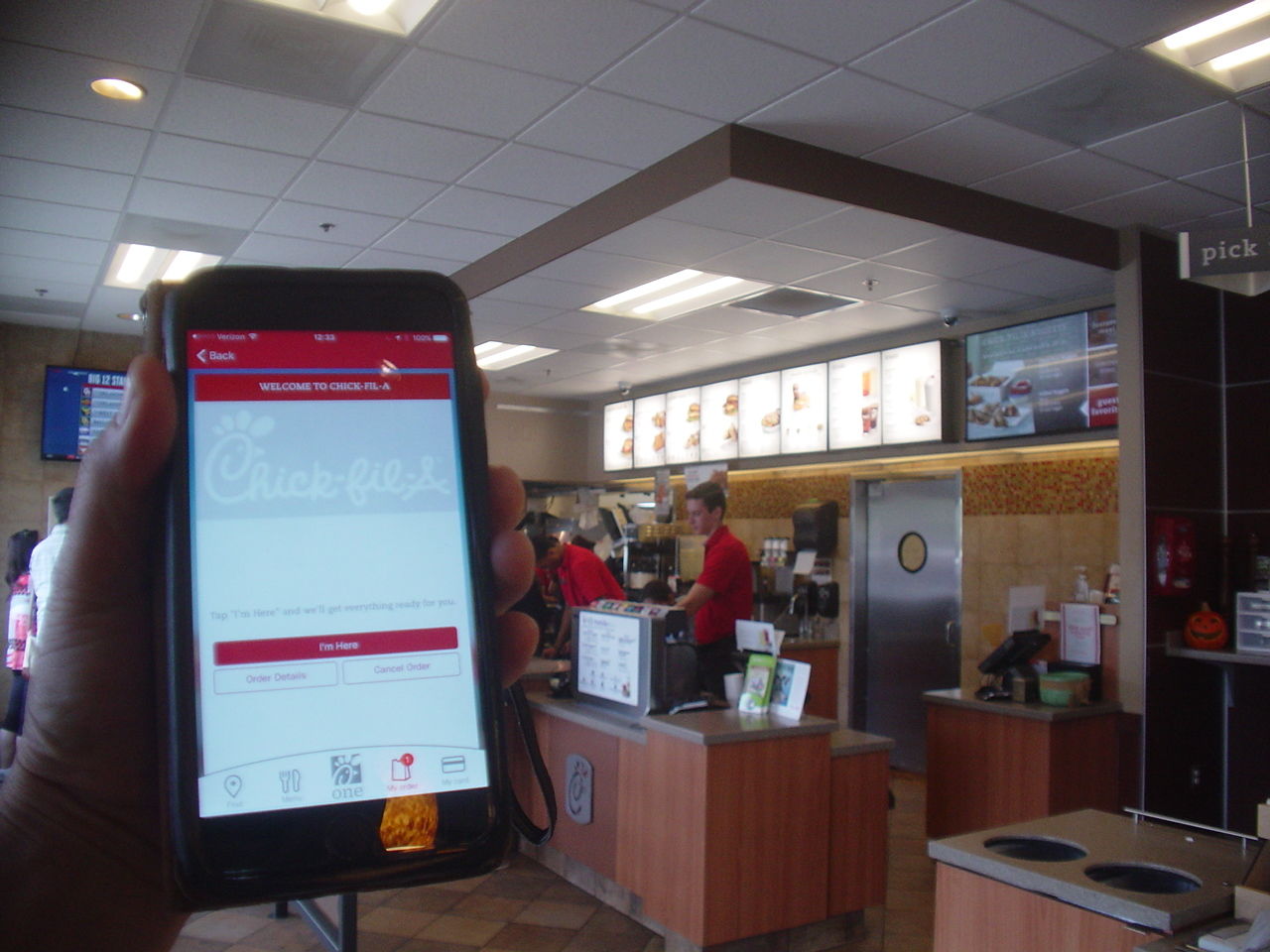 チックフィレのアプリ「チックフィレ・ワン」で事前に注文と決済を行うことで、レジ待ちすることなく注文品を受け取れる。ロサンゼルス郊外シールビーチにあるチックフィレに到着したのは正午頃。店に入っても、レジの長い行列には並ばず、アプリから注文。店内でアプリを起動して「ここにいます(I'm here)」をタップする。