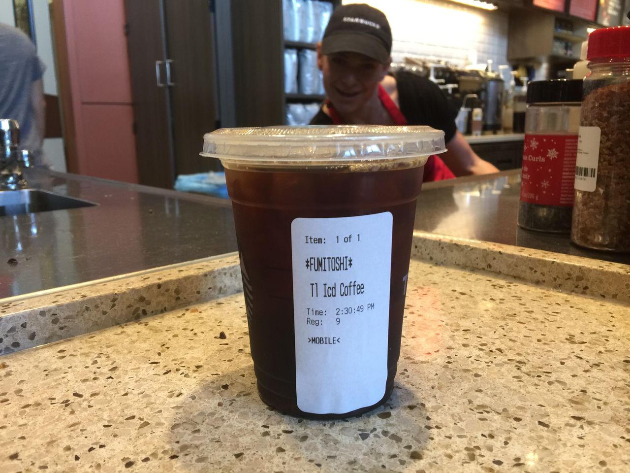 同じショッピングセンター内にはスターバックスがある。クリックリストで商品を積んでもらった後、スタバの「モバイルオーダー&ペイ(Mobile Order & Pay)」でアイスコーヒーを注文した。車で移動して1分、スタバ前に到着して店に入るとアイスコーヒーが出来上がっていた。