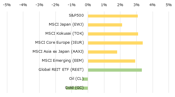 出所: iShares: MSCI Japan (EWJ), MSCI Kokusai (TOK)、MSCI Core Europe (IEUR), MSCI All Country Asia Pacific ex Japan (AAXJ), MSCI Emerging Markets (EEM), GLOBAL REIT ETF (REET). Bloomberg.com: Oil WTI Futures (CL1), Gold Futures (GC1)