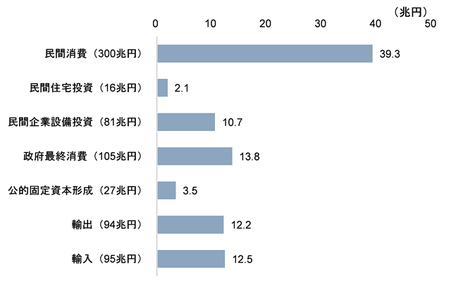 2015年の531兆円から2020年に600兆円へと名目GDPを拡大させるにはどうしたら良いのだろうか。図表10は不足額69兆円(=600兆円-531兆円)を、2015年名目GDPを構成する各支出項目のシェアで按分した結果である。