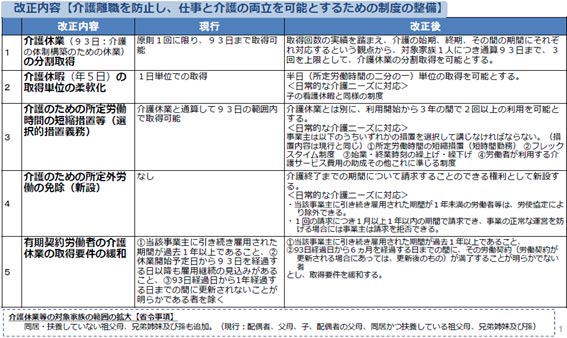 今回の改正では、介護が必要な家族を抱える労働者が介護サービス等を十分に活用できるよう、介護休業や柔軟な働き方の制度を組み合わせて対応できる制度が構築されている。介護休業はもともと、仕事と介護を両立させるための体制を整えるための休業と位置づけられている。そこで、介護保険サービスを受けるなど両立体制が整った後、家族の介護をしながら仕事を継続する際に必要に応じて柔軟な働き方が選択できるよう、介護のための所定労働時間の短縮措置等は介護休業から切り離され、利用開始から3年の間で2回以上の利用が可能となり、介護のための所定外労働の免除(いわゆる残業免除)が、介護終了までの期間について請求することのできる権利として新設された。