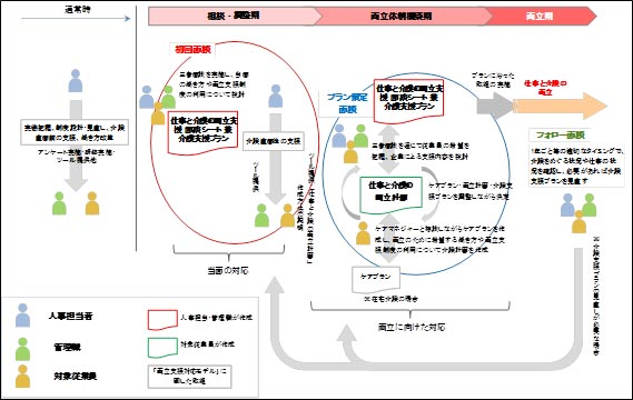 「介護支援プラン」では、介護に直面した従業員への支援として、介護に直面し、働き方の調整を行う必要が生じた段階(「相談・調整期」)から、仕事と介護の両立の体制を築く段階(「両立体制構築期」)、その後両立を図りながら就業を継続し、介護の状況により必要があれば両立の方法を見直す段階(「両立期」)の3つの段階に分かれた支援が提示されている。ただし、介護のプロセスは一様ではないため、状況に応じた支援が求められる。そこで、「介護支援プラン」を作成する際には、対象従業員本人と上司・人事担当者でコミュニケーションを図るような活用方法が示されている。