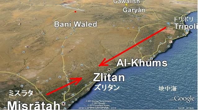 カダフィ軍の拠点トリポリの西にあるズリタン Zlitanが最前線のようで、ミスラタMisratahを制圧した反政府軍と、ここで一進一退の激戦をを繰り返している。上の地中海側から見た地図でも分かるが、カダフィ軍 Gaddafi's forcesにとってもトリポリ西部のZlitanは重要で、ここに相当な規模の軍隊を配置していて、反政府軍もここを制圧するのは容易ではなく、ロシアもここで行き詰っているdead endと言及している。この辺の住民は依然としてカダフィ側からの支援を受けていて、反政府側も安易に踏み込めない状況だ。ここを切り崩すには双方に相当な被害が予想され、裏では互いに政治的解決を模索している。参照記事 ズリタンからのYOUTUBE映像