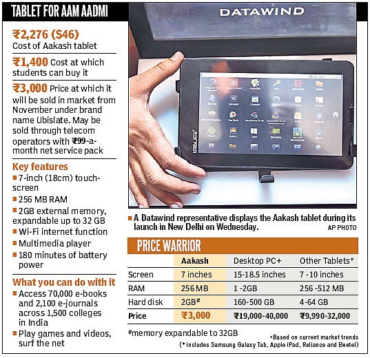 インド政府は2011年10月5日、およそ3,500円という世界最低価格のタブレット端末を発表した。今回発表されたタブレット端末「アーカシュAakash」は、 インド工科大学とイギリスのデータウインドDatawind社が共同開発したもので、基本ソフトには、アメリカ・グーグル社の「アンドロイド Android 」を採用している。インド政府はまず10万台のAakashタブレットを英国Datawindから1台あたり2276インドルピー(3500円)で購入し、パイロットテストとして政府補助を支給し、学生たちには