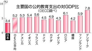 経済協力開発機構(OECD)は2011年9月13日、国内総生産(GDP)に占める日本の教育への公的支出割合は3.3%で、比較できる加盟31カ国の中で最下位だったとする調査結果を公表した。