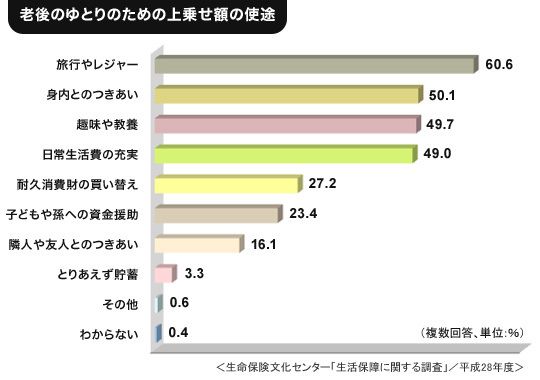 つまり、ゆとりのための上乗せ額は約13万円であり、その使いみちは、「旅行やレジャー」「身内とのつきあい」「趣味や教養」など、以下の通りである(図表参照)