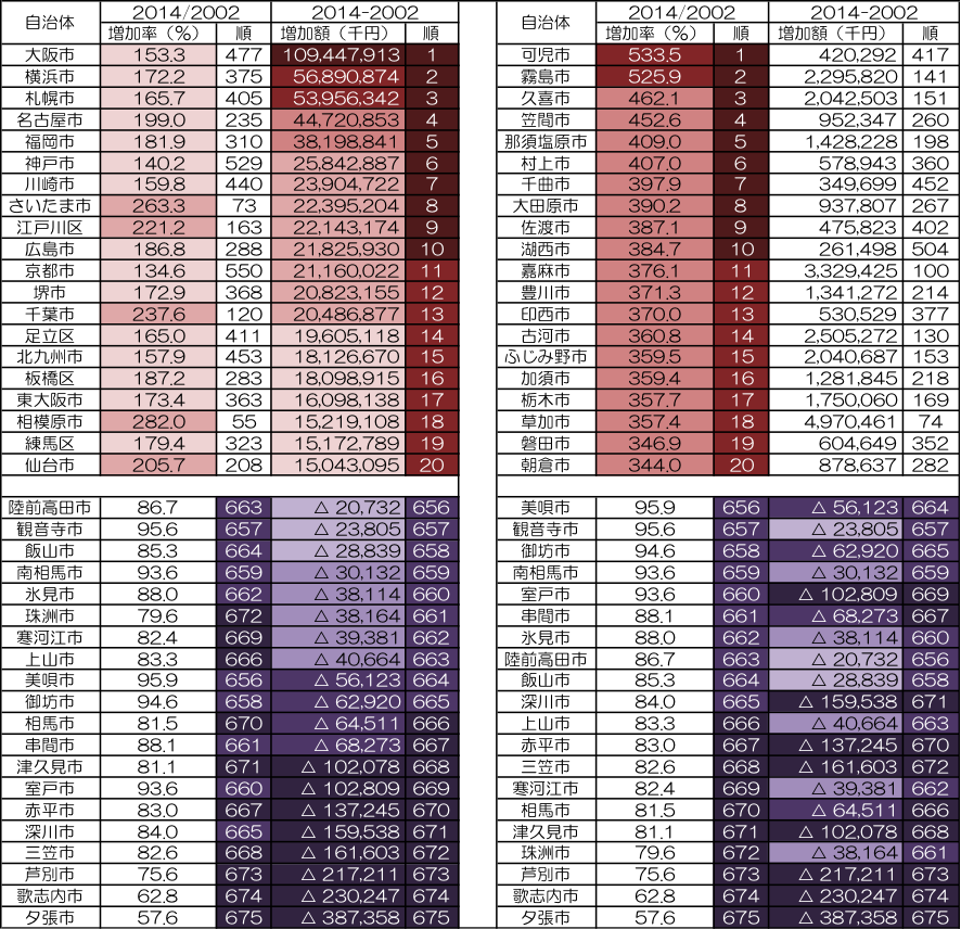 増加額で見ると、最も増えているのは大阪市(大阪府)で、2002年から2014年までの間に1,094億4,791万円も増えている。