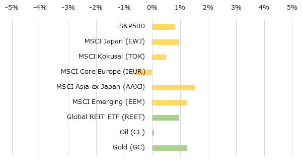 出所: iShares: MSCI Japan (EWJ), MSCI Kokusai (TOK)、MSCI Core Europe (IEUR), MSCI All Country Asia Pacific ex Japan (AAXJ), MSCI Emerging Markets (EEM), GLOBAL REIT ETF (REET). Bloomberg.com: Oil WTI Futures (CL1), Gold Futures (GC1)