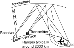 OTHレーダーは、短波帯を用いて電離層(Ionosphere)と電波の相互作用を利用し、長距離探知を可能にします(上図参照)。冷戦初期に弾道ミサイル警戒システムとして配備されたのが始まりで、現在では条件次第で3,000kmまで探知可能なものもあります。ただ、電離層の密度などが天候や太陽活動に左右されるため、OTHレーダーの探知距離は随時変化してしまうという弱点があるほか、特性上、近距離のものは探知できません。さらに、精度も低く、距離分解能が10kmというようなものもあります。これは、2つの対象の距離が10km以上離れていないと、レーダー画面上、別々のものだと認識できないということです。