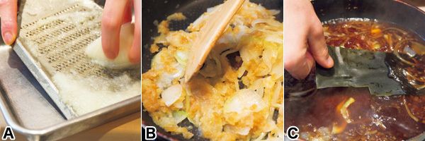 (1)玉ねぎは、1/2個を粗めのおろし金ですりおろし(写真A)、1/4個を薄くスライスする。
