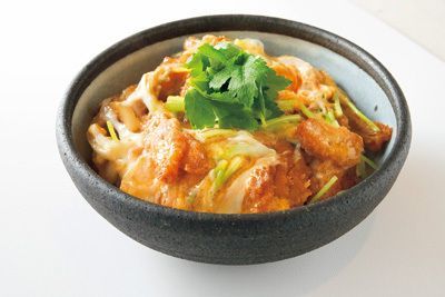 (4)丼にご飯をよそい、(3)のかつ煮を上に滑らせるように盛りつける。卵のとろとろの部分が流れ落ちないように気をつけて。三つ葉の葉の部分を上から散らし、完成。