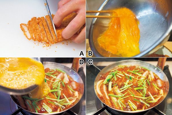 (3)親子鍋(小さいフライパンでも可)に、丼つゆ、玉ねぎを入れる。中火で玉ねぎがしんなりするまで煮たら、(1)のかつを加える。三つ葉の茎の部分を上から散らし(C)、手早く(2)の溶き卵を流し入れる(D)。すぐ蓋をし、弱火で30秒。もたつき厳禁、程よい半熟加減に仕上げよう。