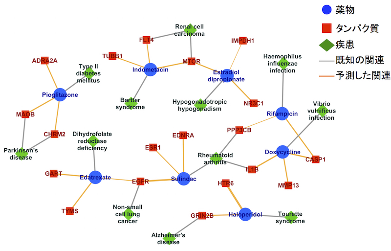 はい。大まかな手順としては、一つの薬に着目して、その薬が作用するタンパク質が分かっていなければそれを予測する、分かっている場合はそれ以外に相互作用するかもしれない他のタンパク質を予測する、この操作を繰り返していきます。様々な疾患の分子機序情報を基に、タンパク質を介してその薬を疾患に結びつけ、未知の関係性を発見していく。僕らの最近の研究では、日本や欧米における約8000個の薬に対してドラッグリポジショニングを行い、がんや神経変性疾患、免疫疾患など、約千種類の疾患に対する効能を予測しました。