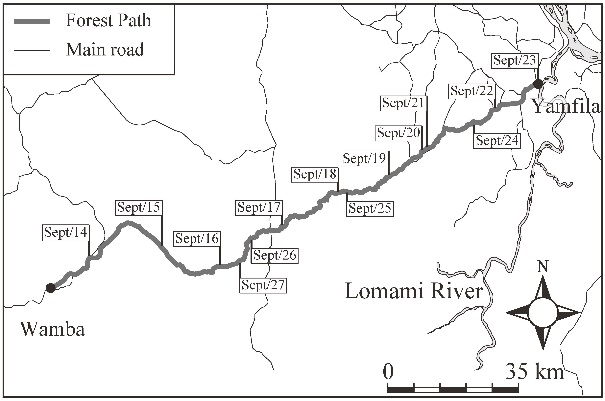 私が家を建てているヤリサンガ村で、一番実直で信頼できるディヤマン氏にその仕事を頼み、前払いに5万コンゴフラン(約5000円)を渡し、データが回収できたあかつきにはさらに5万フラン払うという約束をした。依頼した直後に私はフィールドを後にしたが、ワンバに滞在して調査をしていた大学院生の横塚彩さんにGPSを回収してもらい、後に日本で無事に入手することができた。そこから取り出したデータが図2である。