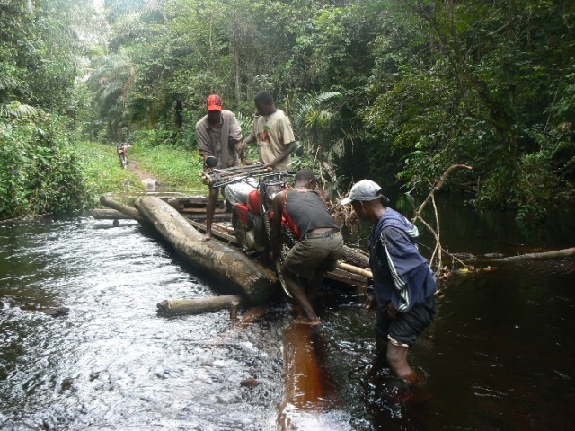 そこで、彼と一緒にワンバからキサンガニ方面に行き、交易の目的地である市場を見てみることにしたのである。もちろん歩いては無理なので、2台のバイクで運転手を雇って行くことになった。バイクならかろうじて、昔の自動車道路沿いに走ることができる。ただし道は相当遠回りになり、約500kmの行程である。バイクで行ったことのある人に、入念に道の様子を聞き、また経験を積んだ優秀な運転手を雇った。