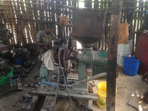 途中の小さな町で2泊し、3日目の午後、ワンバの村人たちがよく口にしていたヤフィラの市場に着く。近づいてまず聞こえてきたのは、籠もったエンジンの音だった。市場の入り口付近に、近くに住むトポケの人たちが作った米を籾摺り・精米している小屋 (rizerie) が立ち並んでおり(写真4)、米が一杯に詰まった大きな袋が並べられていた。