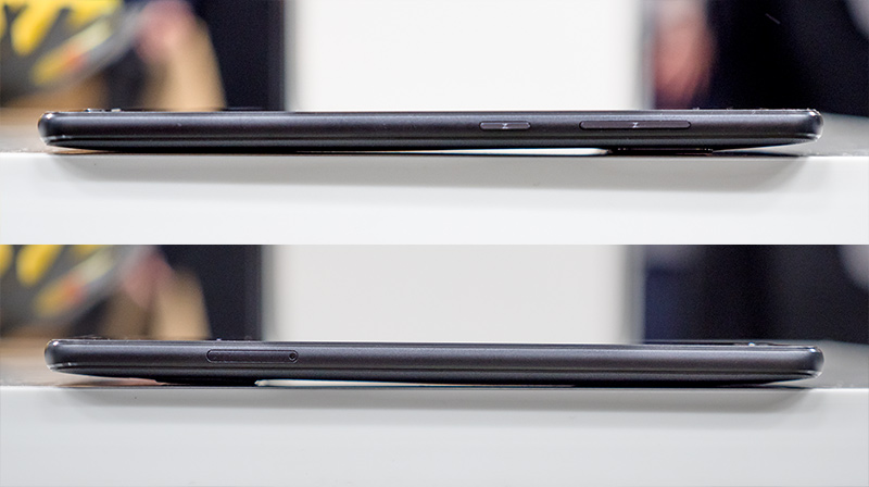 右側面(写真=上)には電源キーとボリュームキー、左側面(写真=下)にはSIMカードのトレーがある。DSDS(デュアルSIMデュアルスタンバイ)対応のSIMトレーにはnanoSIMカード(4FF)を2枚もしくはnanoSIMカード1枚とmicroSDカードという組み合わせで利用できる。つまり、microSDカード利用時にはDSDSは使えないことになる。