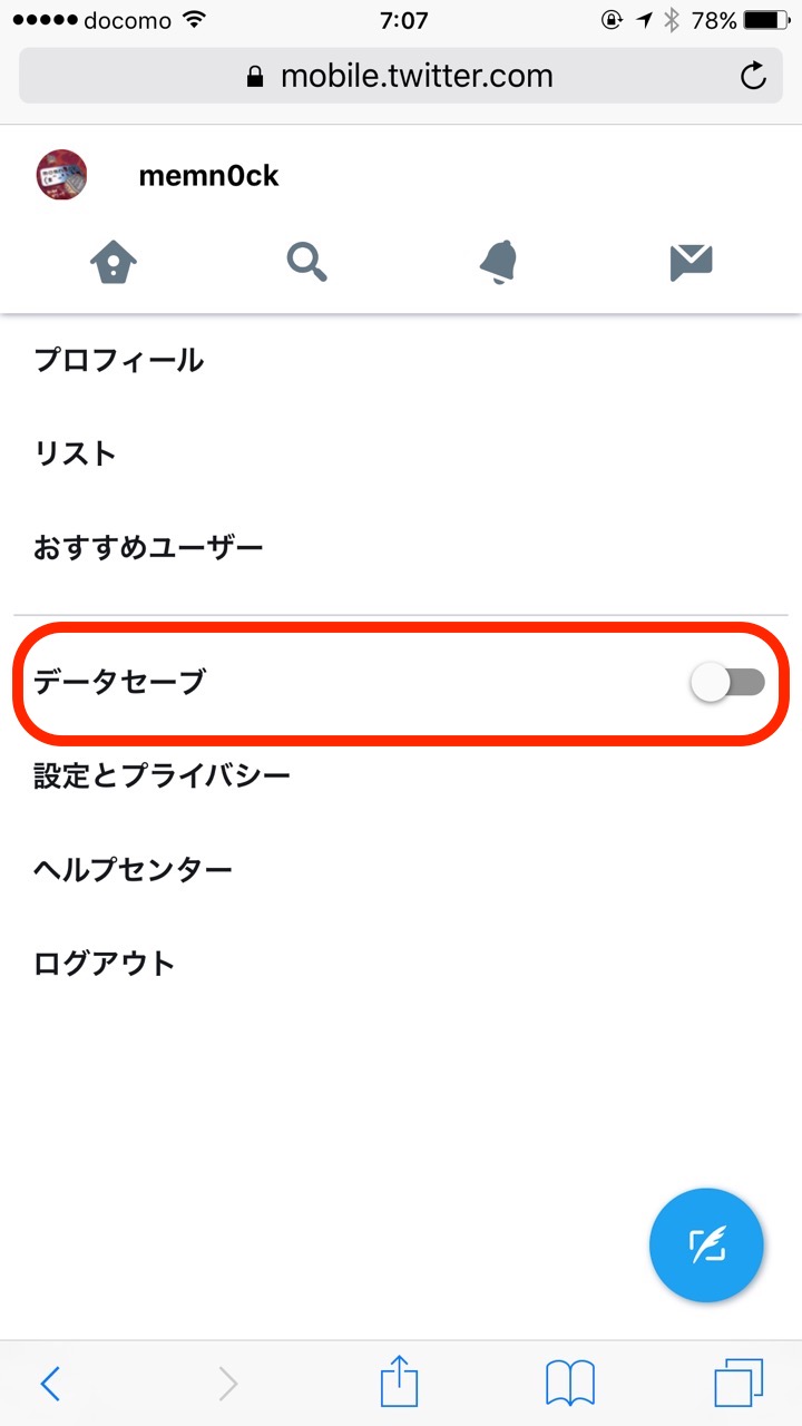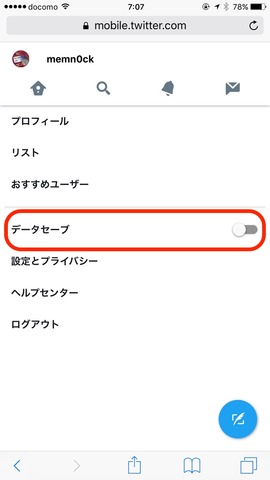 さらに設定にAndroidやiOS向けアプリにはない「データセーブ」という項目があり、初期状態ではオフになっていますが、オンにすることでよりデータ量を抑えて利用できるほか、アプリにもあるタイムラインの画像プレビューをオフにする機能もあります。