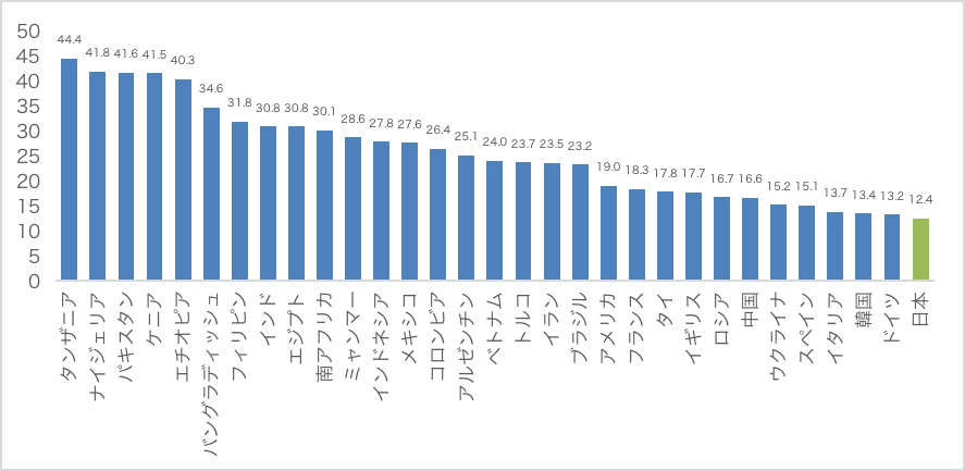 人口4,000万人以上の国31ヶ国で日本は子どもの割合が最低