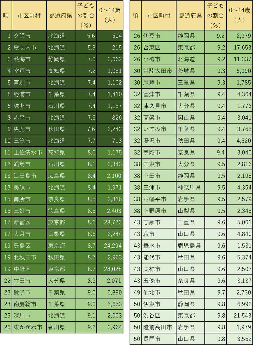 【自治体ランキング】子どもの割合が世界で最も低い日本。自治体別では新宿区もワースト17位…