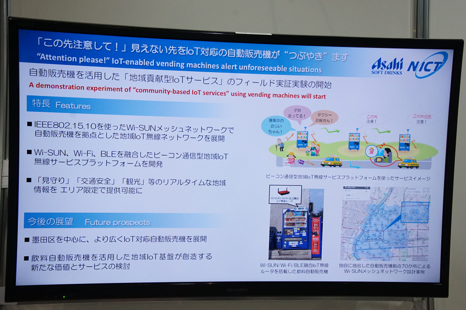 NISTはこのWi-SUNを活用する実証実験として、自動販売機をスポットとした地域の見守りサービスやタクシーの運行管理支援サービスなどを提案しています。
