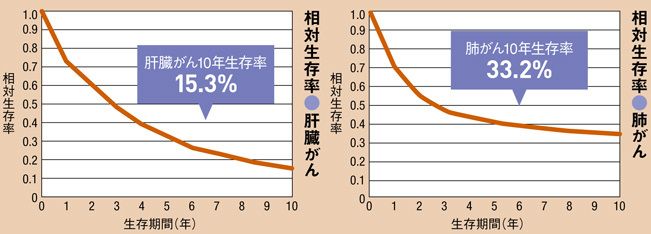 同様に10年生存率が低いのが肝がんだ。肝がんの9割はB型肝炎ウイルス(HBV)、C型肝炎ウイルス(HCV)感染が原因。特にHCV感染者の約7割は慢性肝炎へ進行し、そのうちの3割が肝硬変、さらに肝がんを発症する。健康診断でHBV、HCV感染が判明すると定期検査を強く勧められるのはこのためだ。