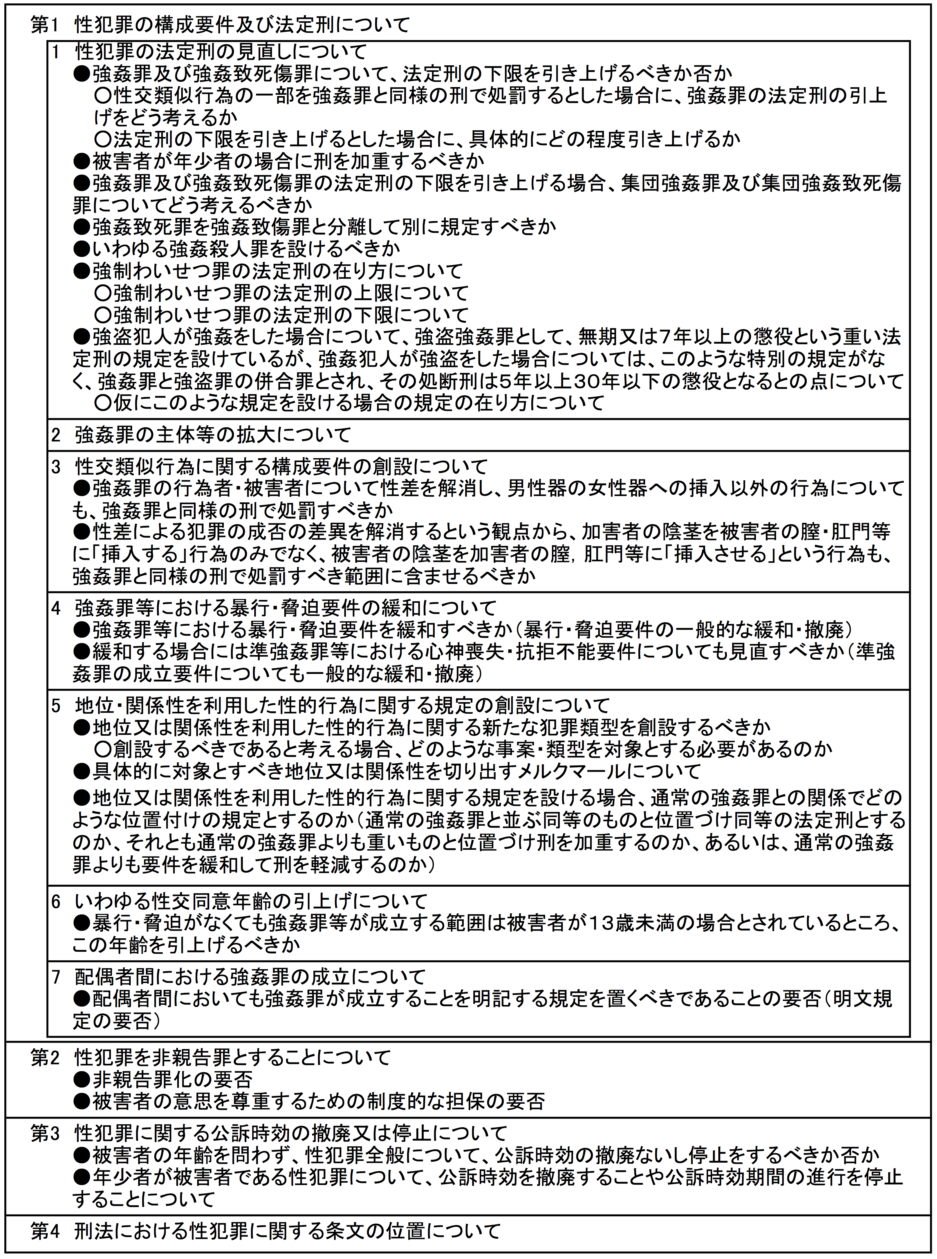 本改正案が国会に提出されるまでには、内閣府の女性に対する暴力に関する専門調査会(2011年5月~2012年7月)、法務省の性犯罪の罰則に関する検討会(2014年10月~2015年8月)、法制審議会・刑事法(性犯罪関係)部会(2015年11月~2016年6月)などにおいて専門的な議論がなされてきました。特に、性犯罪の罰則に関する検討会では、様々な論点が挙げられ、議論されてきました[表2参照]。