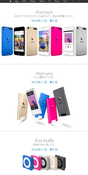 これにより、現時点では「iPod」シリーズは「iPod touch」のみが販売されており、iPodシリーズを比較するページ(Googleキャッシュ)もなくなっています。