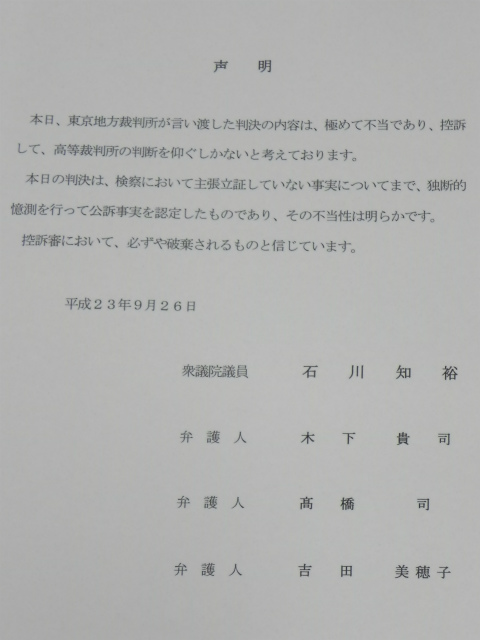 石川知裕議員(以下、石川):今日、東京地方裁判所から判決が出ました。今、木下弁護士が言ったように、判決内容には大変不満を持っております。拘置所の中で検事さんから言われた言葉が忘れられません。それは「事実と裁判の結果は違うものだ」という言葉でした。今日検察が主張してきた水谷建設からの(裏金)5000万円を含め私としては到底受け入れることが出来ない、まったく事実のないことを元に判決内容が下されました。控訴して、断固として戦い続けて行きたいと思っております。