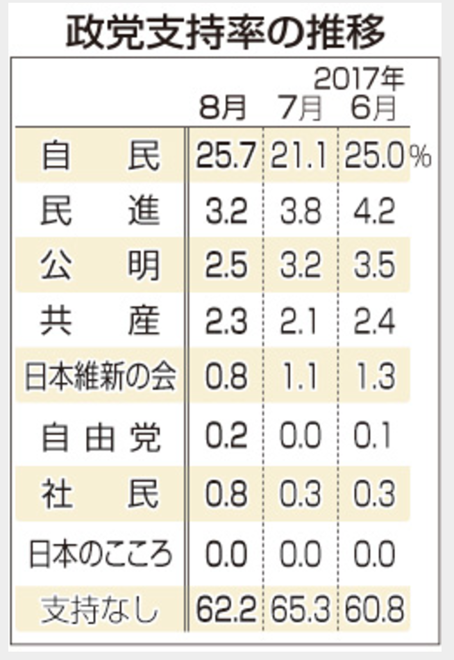 ただ問題は、野党の支持率があまりに低くすぎることです。民進党の最大の誤解は、かつての遺産として議員数がまだ残っていて、野党第一党だと思っていることですが、支持率で見れば、その他大勢の存在でしかないのです。