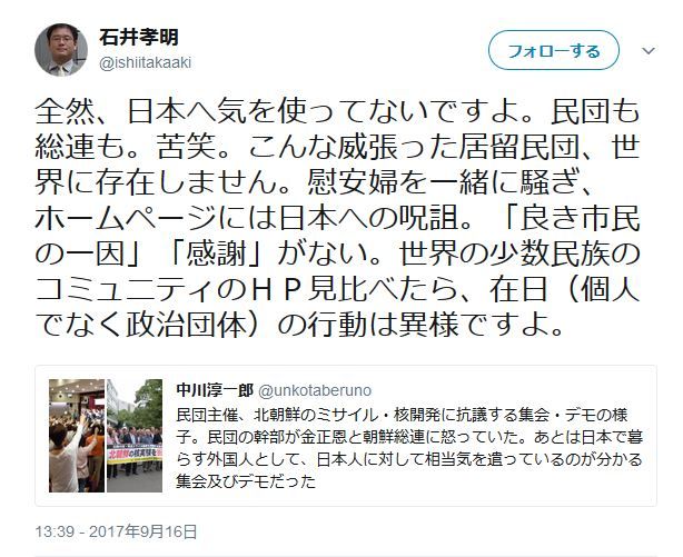 なんというのですかねぇ。今回、民団は「一緒にされたくねぇよ!」という気持ちはあったのかもしれませんが、「我々もあなたたち日本人と同様に北朝鮮の行為には反対です」と示さなくてはいけない、というところまで追い込まれたのかな、という感覚も抱きました。