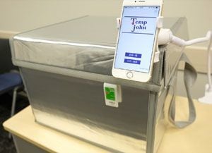 テンプジョンでは、保冷ボックス内に取り付けた手のひらサイズの温度計測器(温度ロガー)を通じて、クラウド上で温度管理をするものだ。ボックス内の温度が設定から外れると、メールでアラームが通知される。