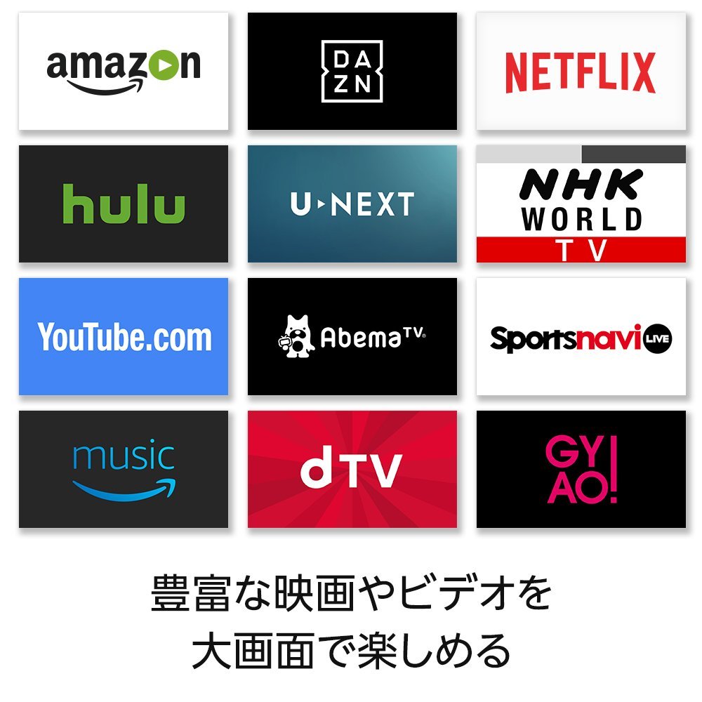 映像配信サービスでは、Amazonプライム・ビデオに加え、Netflix、Hulu、AbemaTV、dTV、DAZNなどのさまざまなコンテンツに対応し、1.5GHzクアッドコアCPUや2GB内蔵メモリー(RAM)、IEEE802.11ac準拠の無線LAN(Wi-Fi)などに対応したことで、4K映像も快適に視聴可能となっています。