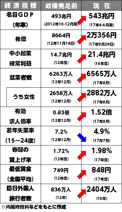名目GDP(国内総生産)は493兆円(2012年10-12月期)から543兆円(17年4-6月期)へと大きく上昇。