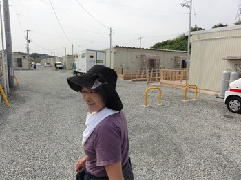 炎天下、管理人として仮設住宅を巡回するハツノさん(2011年8月23日、福島市松川工業団地第1仮設住宅)