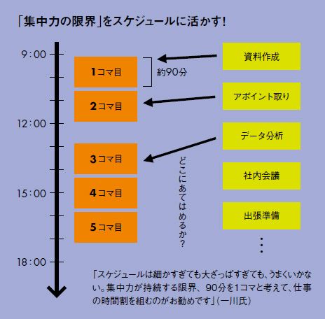 自分の能力で時間通りにできる範囲で計画を組むと、仕事の内容を取捨選択せざるをえなくなる。その結果、仕事にムダがなくなります。(一川氏)