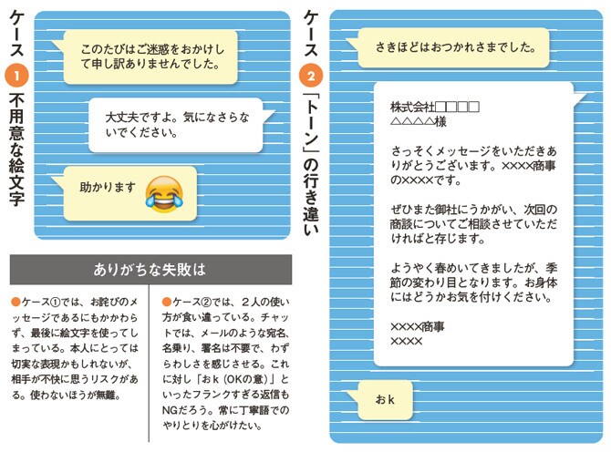 若い人に多いミスは「フランクすぎる表現」です。気軽にやりとりができるため、ついプライベートと同じ感覚になり、言葉遣いがラフになったり、顔文字やスタンプを使ったりする人がいます。ビジネスでの相手であれば、少し慎重になったほうがいいでしょう。