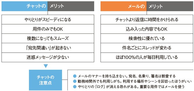 2/2ただし、最近は電話とメールの中間ともいえる「チャットツール」を仕事の場で使う機会が増えています。私自身、たびたびフェイスブックから仕事上の相談を受けます。また「チャットワーク」などの専用ツールを社内に導入する企業も目立ちます。