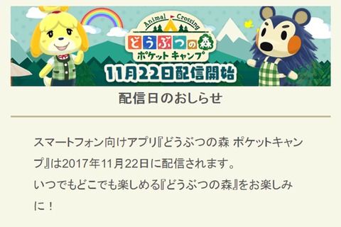 どうぶつの森 ポケットキャンプは、任天堂の人気ゲームの1つ「どうぶつの森」をスマホなどで遊べるようにしたものです。2017年11月下旬の配信が予定されていましたが、予定通りのスケジュールで配信されることになりました。