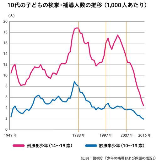 そしてその後、非行少年は一貫して減少し、現在は毎年、戦後最低を更新し続けている状況です。不良という言葉の範疇には、罪を犯していない少年も含まれるはずですが、その中核となる非行少年がここまで減少しているとなると、不良と呼ばれる子どもの数全体も以前と比べてかなり減っているはずだと推測できます。