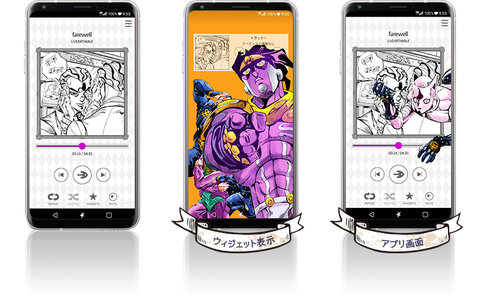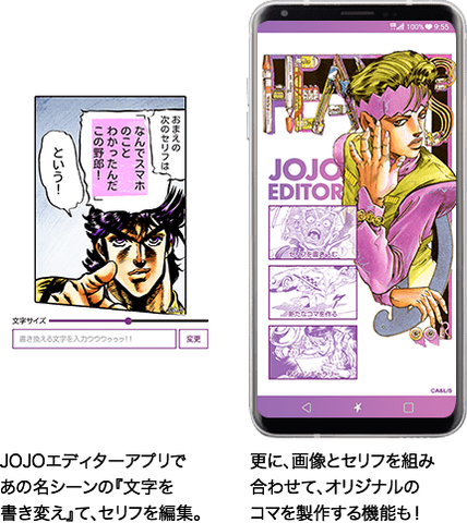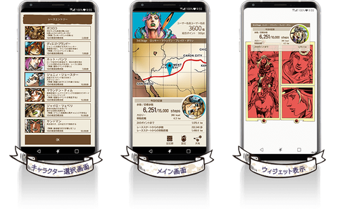 その他、名シーンの文字を書き換えることができるオリジナルアプリ「JOJOエディター」を搭載し、セリフを編集することでオリジナルのコマを製作する機能も搭載。実際に歩いた歩数に応じて「STEEL BALL RUN」レースのコースを仮想的に踏破できる歩数計連動アプリなど、多彩なコンテンツが満載となっています。