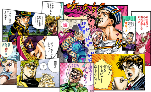 2/2さらにジョジョの特徴でもある「ゴゴゴ」などの擬音が通知音や操作音の代わりに画面上に表示される新システムを採用し、漫画の描き文字のように見えるジョジョならではの「擬音」を表示できるようになっています。第1部~第8部の全エピソードの中から厳選した名シーンの数々を画像として内蔵し、作中に登場する名言や固有名詞に対応した専用の予測変換辞書もも搭載しています。