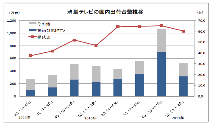 家電業界は、3D対応テレビに突っ込み、撃沈してしまったわけですが、実際の市場が受け入れてきたのはインターネト対応テレビでした。JEITAの出荷統計では、2010年度にはすでにインターネット対応テレビが薄型テレビの6割を超えています。